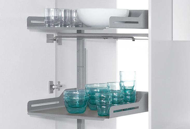 Górne ramię mocowane jest od spodu najwyższej półki, do boku szafki. Dzięki temu przestrzeń nad półką jest nieograniczona co pozwala maksymalnie wykorzystać system niezależnie od wysokości szafki.