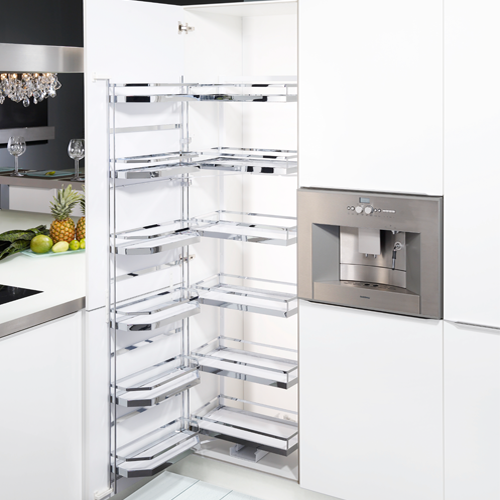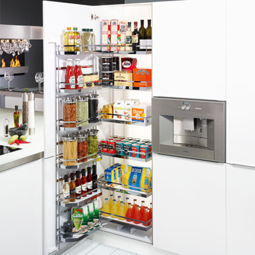 Na pierwszy rzut oka – lodówka. Cargo z półkami na drzwiach, jak w klasycznej chłodziarce. Dodatkowo półki w korpusie, wysuwają się do przodu podczas otwierania drzwi. Dzięki takiemu rozwiązaniu – mamy dobry widok na zawartość szafki, a wyciąg świetnie sprawdza się jako szafka na zapasy. Oczywiście z cichym domykiem.