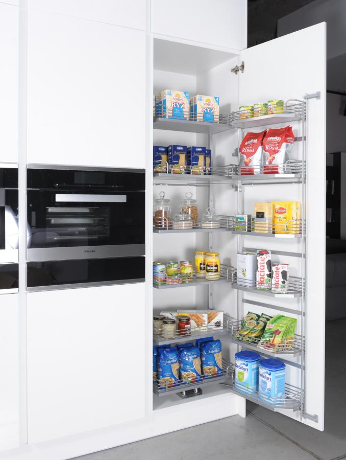 Na pierwszy rzut oka – lodówka. Cargo z półkami na drzwiach, jak w klasycznej chłodziarce. Dodatkowo półki w korpusie, wysuwają się do przodu podczas otwierania drzwi. Dzięki takiemu rozwiązaniu – mamy dobry widok na zawartość szafki, a wyciąg świetnie sprawdza się jako szafka na zapasy. Oczywiście z cichym domykiem.