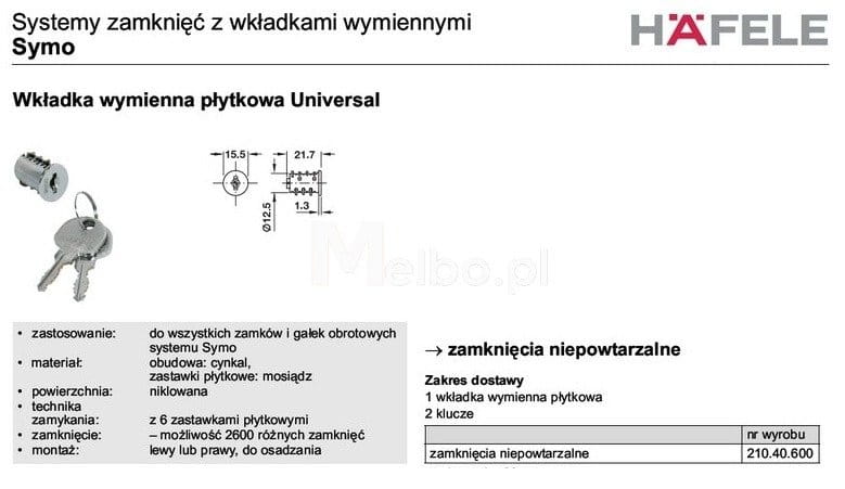 WKŁADKA SH WYMIENNA PŁYTKOWA UNIVERSAL zamknięcia niepowtarzalne + 2 KLUCZE SYMO Häfele 210.40.600