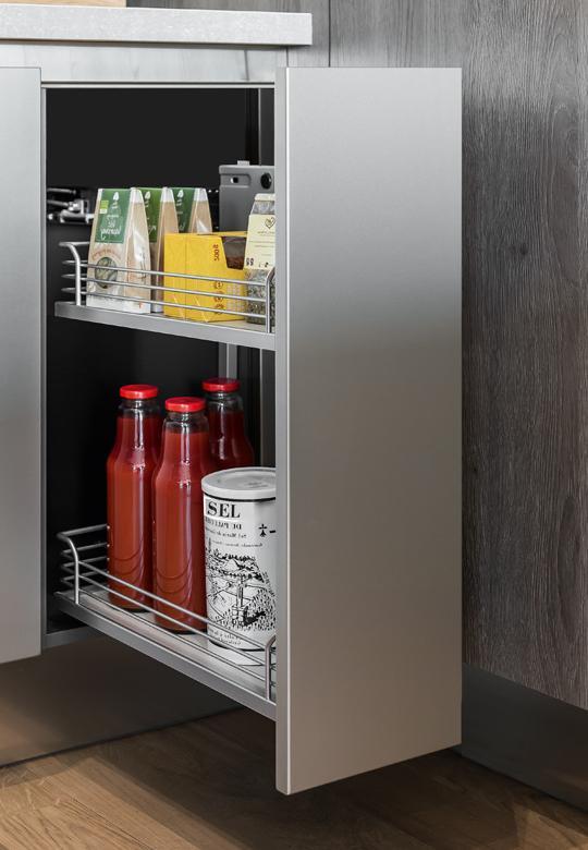Dwupółkowy wyciąg typu cargo przeznaczony do szafki podblatowej o szerokości frontu 200 mm. Wyciąg dostępny jest z koszykami z linii ARENA Classic Silver. Kosze wykończone są okrągłymi relingami wykonanymi z malowanego proszkowo drutu i drewnianym dnem pokrytym powłoką antypoślizgową. Rama z 3 haczykami na których zawieszamy kosze. Rozstaw haczyków: pierwszy znajduje się 10 cm od dołu ramy, drugi na wysokości 24 cm od pierwszego, trzeci 15 cm powyżej drugiego. Taki rozstaw haczyków pozwala na indywidualne zawieszenie koszy w miarę własnych potrzeb.System jest uniwersalny, montaż prowadnicy może być do prawego lub lewego boku szafki. Prowadnica górna montowana jest do boku szafki a dolne prowadzenie do jej dna co zapewnia stabilność i wytrzymałość konstrukcji. Cały montaż jest bardzo prosty i szybki dzięki klipsom łączącym ramę z prowadnicą. Mechanizm wyposażony jest w system cichego domykania.