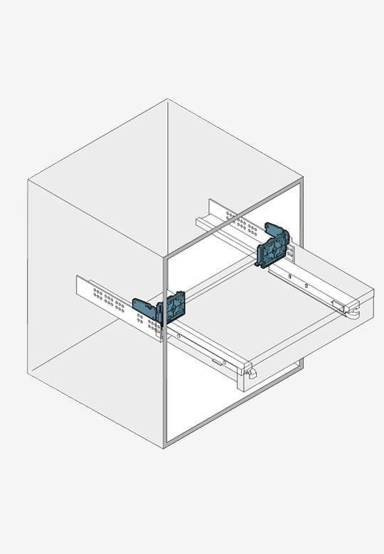 Zestaw składa się z krzywki prowadzącej do ścianek bocznych i elementu blokującego wysuw. Mechanizm blokujący montowany powinien być nad systemem prowadnic na bocznej ścianie oraz z tyłu. Wymagane jest tylko 18 mm miejsca za półką. Strona montażu - prawa. Przy szerokości do 500 mm wystarczy zastosować jeden mechanizm (do wyboru lewy lub prawy), natomiast dla większych szerokości od 550 mm zaleca się stosowanie dwóch mechanizmów (zarówno po lewej stronie, jak i po prawej stronie półki).