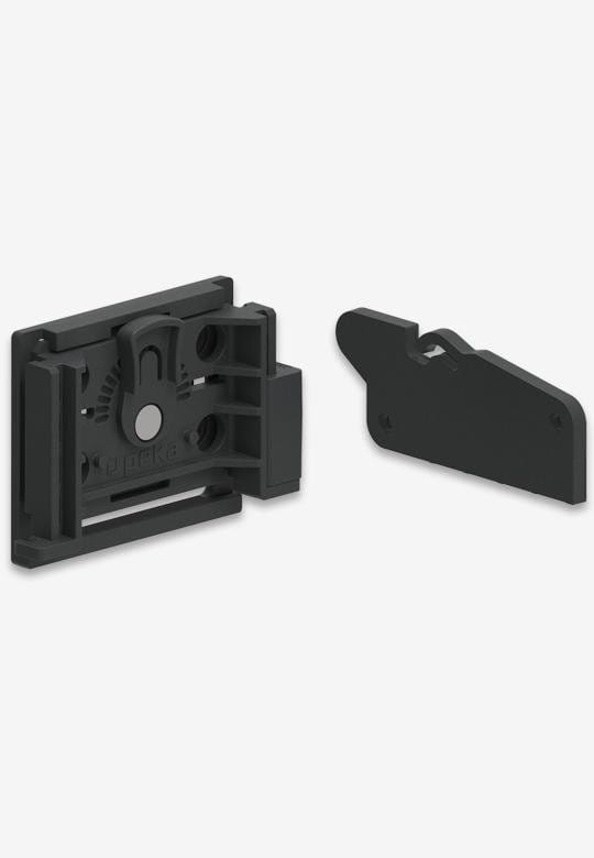 Zestaw składa się z krzywki prowadzącej do ścianek bocznych i elementu blokującego wysuw. Mechanizm blokujący montowany powinien być nad systemem prowadnic na bocznej ścianie oraz z tyłu. Wymagane jest tylko 18 mm miejsca za półką. Strona montażu - prawa. Przy szerokości do 500 mm wystarczy zastosować jeden mechanizm (do wyboru lewy lub prawy), natomiast dla większych szerokości od 550 mm zaleca się stosowanie dwóch mechanizmów (zarówno po lewej stronie, jak i po prawej stronie półki).
