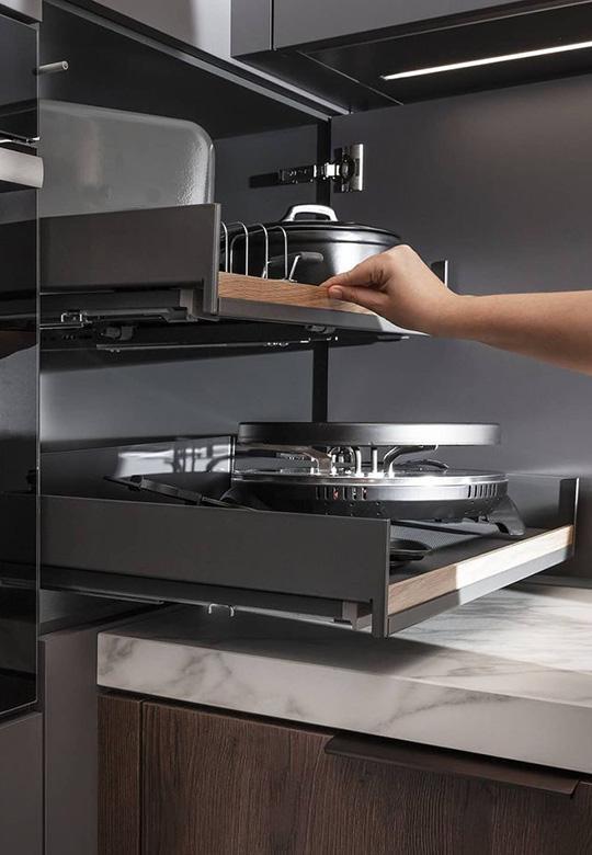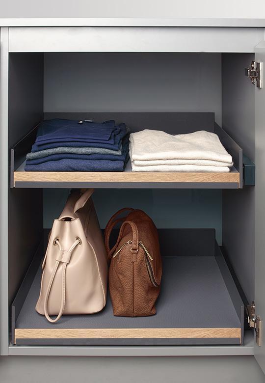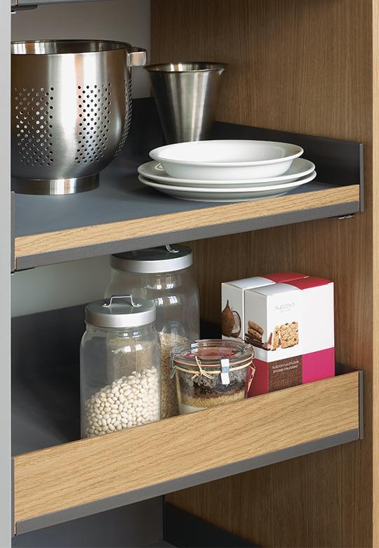 Oferujemy półkę Extendo w linii Fioro jako fantastyczną alternatywę dla tradycyjnych nudnych szuflad. Nasze półki nadają się do wnętrza kuchennych szafek wysokich i niskich, montowanych po kilka półek w jednej przestrzeni ale również jako pojedyncza półka, rewelacyjnie dopasowując się do każdej kuchennej spiżarni czy skrytki, szafy garderobianej czy gospodarczej. Półki Extendo pasują do standardowych drzwi skrzydłowych lub przesuwnych, genialnie komponują się w szafkach z roletami a otwartym meblom nadają stylu i szyku. Półki Extendo z drewnianymi dębowymi listewkami będą świetnie wyglądać z meblami z tym samym lub zbliżonym wykończeniu.