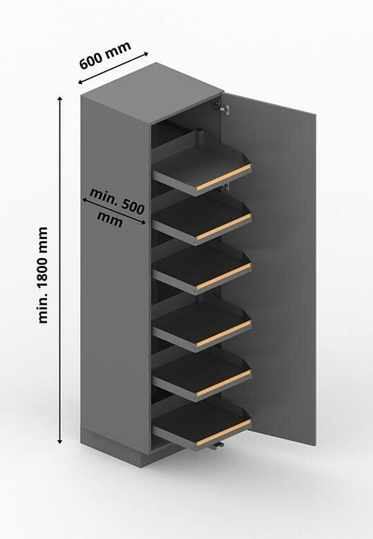 Spiżarnia Pleno posiada w komplecie 6 półek, wiszących na haczykach rozmieszczonych co 10 cm, a użytkownik sam może zmienić ich rozmieszczenie. Pleno pozwala nam na maksymalne wykorzystanie przestrzeni, łatwy dostęp i przegląd umieszczonych w nim produktów.