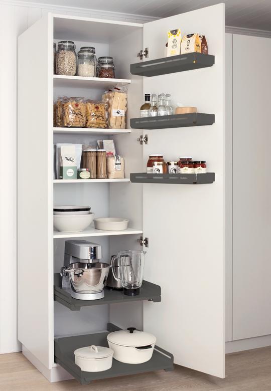 System Trio to zestaw półek Tablo i Extendo do montażu w szafce wysokiej o szerokości frontu 600 mm i z frontem mocowanym do korpusu na standardowych zawiasach meblowych. Nowoczesna spiżarnia oferuje kombinację dużych, wysuwanych koszy mocowanych najniżej wewnątrz szafki, standardowych półek meblowych i mniejszych półek mocowanych na drzwiach, wszystko po to zapewnić maksymalną wygodę użytkowania, doskonałą widoczność umieszczanych produktów i bezpośredni do nich dostęp.