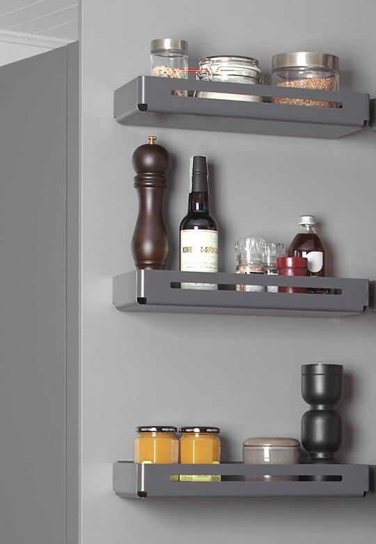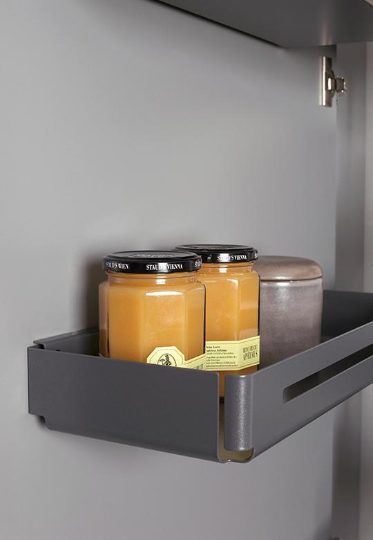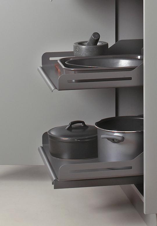 Półki Tablo i Extendo wykonane są w całości z wysokiej jakości stali, specjalnie profilowanej w procesie produkcji, bez użycie spawów i nitów, co uniemożliwia powstawaniu korozji. Półki są malowane proszkowo w kolorze antracytowym, dodatkowo dno zabezpieczone jest matą antypoślizgową. Do półek Extendo dołożone są prowadnice Grass Dynapro 450 i listwy dystansowe, pozwalające swobodnie wysunąć półki poza korpus szafki.