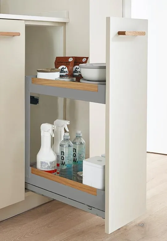 Pinello Liro Cargo 200 to wysuwane cargo z dwoma półkami wykończonymi dębowymi listewkami dekoracyjnymi. Jest to świetne cargo podblatowe dla małych przestrzeni przy zlewie lub kuchence. Idealnie nadają się do montowania w 200 mm przestrzeniach w meblach kuchennych, które mogłyby być zaślepione i tym samym zmarnowane.