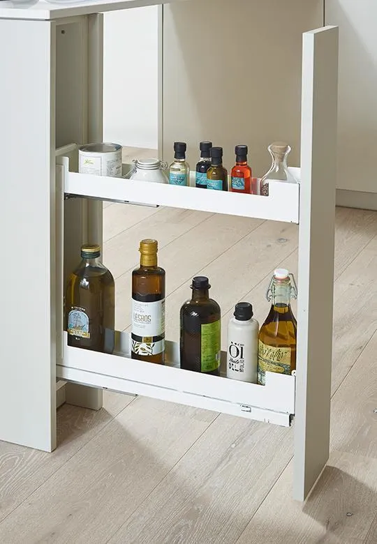 Pinello Liro Spice 150 to małe cargo z dwoma półkami. Świetne rozwiązanie dla małych przestrzeni wokół zlewu. Idealnie nadaje się do montowania w wąskiej przestrzeni w meblach kuchennych, która mogłyby być zaślepiona i tym samym zmarnowana.