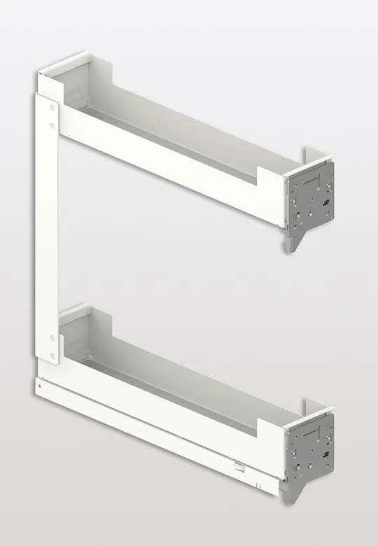 System opiera się na prowadnicy Grass o długości 500 mm z pełnym wysuwem, co zapewnia bardzo wygodne korzystanie na co dzień. Dzięki pełnemu wysuwowi, przechowywane produkty kuchenne są widoczne i łatwo dostępne od razu po wysunięciu z szafki. Wbudowany mechanizm Softclose zapewnia płynne i ciche zamykanie urządzenia. System może być obsługiwany prawo / lewo, ponieważ prowadnice są umieszczone pod półkami i są praktycznie nie widoczne.
