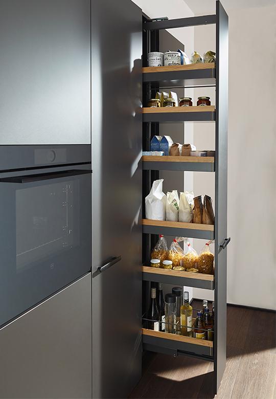 Cargo Dispensa Liro z drewnem z sześcioma koszami, jest przeznaczone do szafki o szerokości 40 cm i idealnie komponuje się w meblach kuchennych. Proponujemy umieścić je tuż obok lodówki, po to aby zgromadzone produkty były zawsze pod ręką i w jednym miejscu. Szafka z systemem cargo Dispensa bez problemu pomieści duże ilości zapasów spożywczych i pozwoli wygodnie je poukładać - tworząc praktyczną spiżarnię. Po wysunięciu Dispensy z szafki otrzymujemy doskonały dostęp do wszystkich umieszczonych produktów z obu stron.