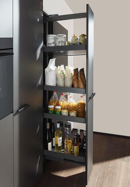 Cargo Dispensa Liro 300 czterema koszami, polecamy szczególnie do mebli kuchennych. Najlepiej umieścić je tuż obok lodówki dzięki temu zgromadzone produkty będą w jednym miejscu. Szafka z systemem cargo Dispensa bez problemu pomieści duże ilości zapasów spożywczych i pozwoli wygodnie je poukładać - tworząc praktyczną spiżarnię. Po wysunięciu Dispensy z szafki otrzymujemy doskonały dostęp do wszystkich umieszczonych produktów z obu stron.