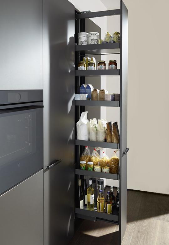 Cargo Dispensa Liro 400 z sześcioma koszami, polecamy szczególnie do mebli kuchennych. Najlepiej umieścić je tuż obok lodówki dzięki temu zgromadzone produkty będą w jednym miejscu. Szafka z systemem cargo Dispensa bez problemu pomieści duże ilości zapasów spożywczych i pozwoli wygodnie je poukładać - tworząc praktyczną spiżarnię. Po wysunięciu Dispensy z szafki otrzymujemy doskonały dostęp do wszystkich umieszczonych produktów z obu stron.
