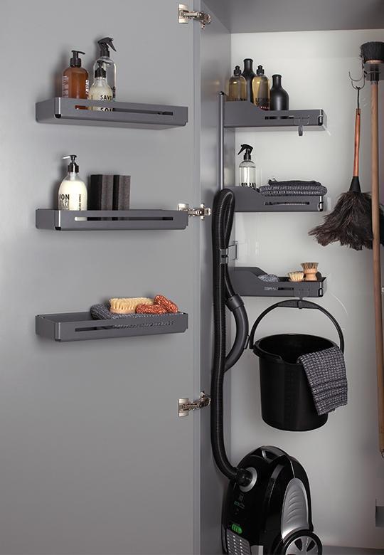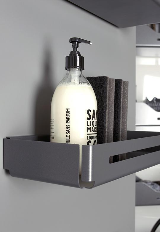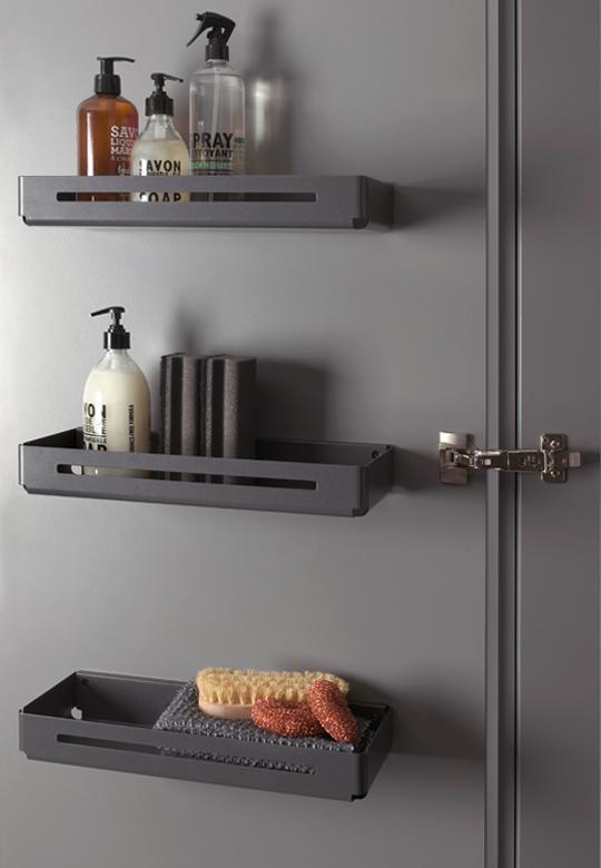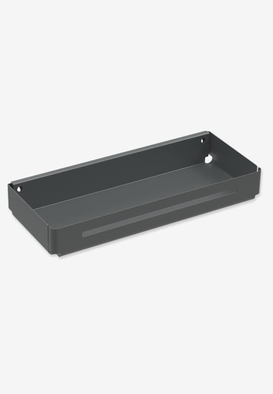 Półka Tablo Libell wykonana z wysokiej jakości wyprofilowanej blachy z matą antypoślizgową w kolorze antracytowym. Półka ma szerokie zastosowanie w różnych rodzajach szafek. Montowana do boku, może być umieszczona na froncie szafki jak i wewnątrz. Montaż półki na froncie możliwy przy szerokości min. 490 mm. W tym przypadku, aby jednak nie wystąpiła kolizja przy zamknięciu frontu, należy zamontować półkę min. 38 mm od wewnętrznej krawędzi frontu. W przypadku półki wewnątrz korpusu półkę Tablo montujemy min. 20 mm od czoła szafki.