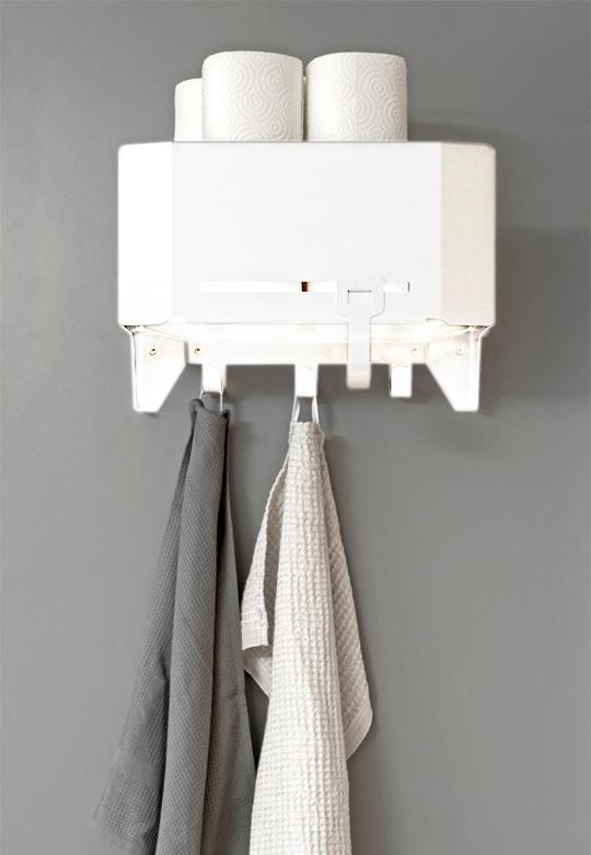 Zestaw składa się z półki metalowej z 3 stałymi haczykami, 1 dodatkowego haczyka, 4 śrub montażowych. System może być montowany w każdym dowolnym miejscu jak również bezproblemowo demontowany.