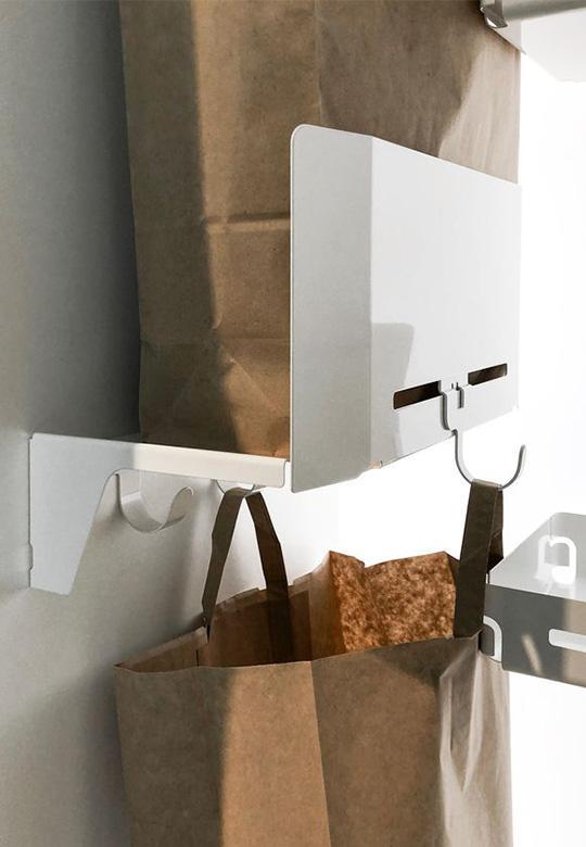 SESAM Bag - to innowacyjne połączenie specjalnie profilowanej metalowej mini półki wraz z wieszakami. System wykonany jest w całości z jednego kawałka metalu, malowanej proszkowo w kolorze białym.