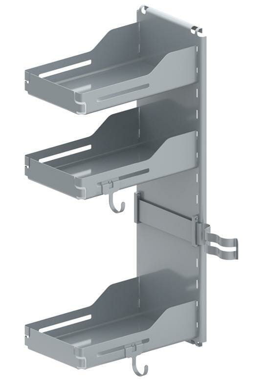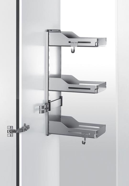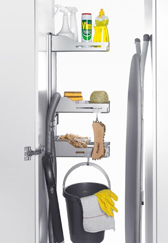 Elastycznie ustawiane haczyki zaciskowe to kolejna zaleta SESAM Standard, pozwalająca na optymalne wykorzystanie przestrzeni między półkami. Możesz przechowywać na nich różne drobiazgi, a uchwyt na wąż odkurzacza gwarantuje że będzie on zawsze na swoim miejscu. Po zamontowaniu w szafce, SESAM Standard nie zajmuje wiele miejsca, co daje możliwość przechowywania innych potrzebnych rzeczy.