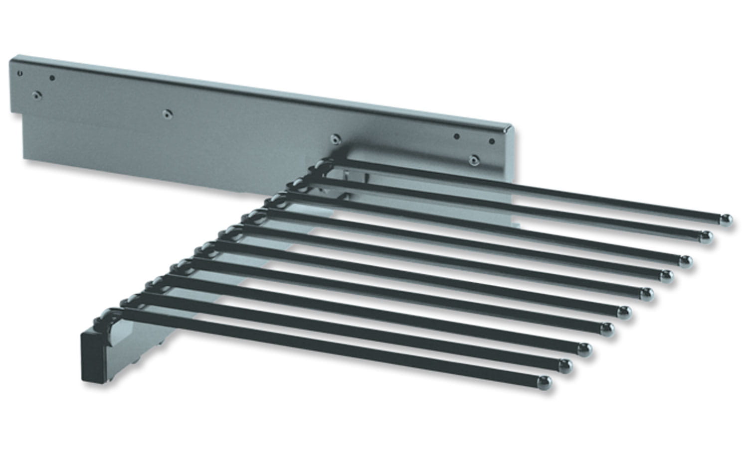 10 chromowanych, ruchomych wieszaków pokrytych antypoślizgowym materiałem , ze srebrnym stelażem. Uniwersalny montaż do prawego lub lewego boku.