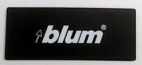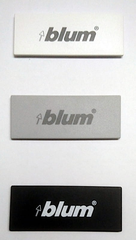 Prostokątna zaślepka ZAA.532 z nadrukowanym logo Blum (sitodruk) w kolorach białym, szarym i czarnym.