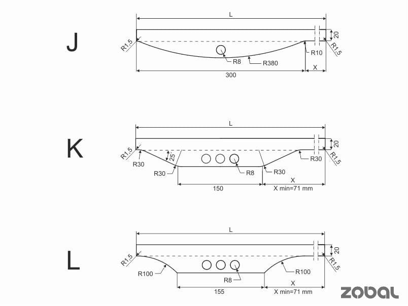 Uchwyty ZOBAL występują przede wszystkim  w wykończeniu C.0. (anoda naturalna), ale istnieje też możliwość zamówienia niektórych z nich w innych kolorach. Uchwyty krawędziowe wpuszczane można zamówić do płyty o grubości 16, lub 18 mm. Różne typy montażu: frezowane, przyklejane, przykręcane. Różne typy frezowań części uchwytowej. Uchwyty od U1 do U8 producent utrzymuje w szerokościach 20, 40, 60, 100 i 150 mm w ciągłej sprzedaży, pozostałe długości są na zamówienie.