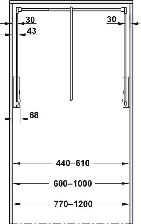 - Regulacja dopasowania do wnęki o szerokości od 600 do 1000 mm — świetne rozwiązanie dla standardowych szaf przesuwnych lub garderób.