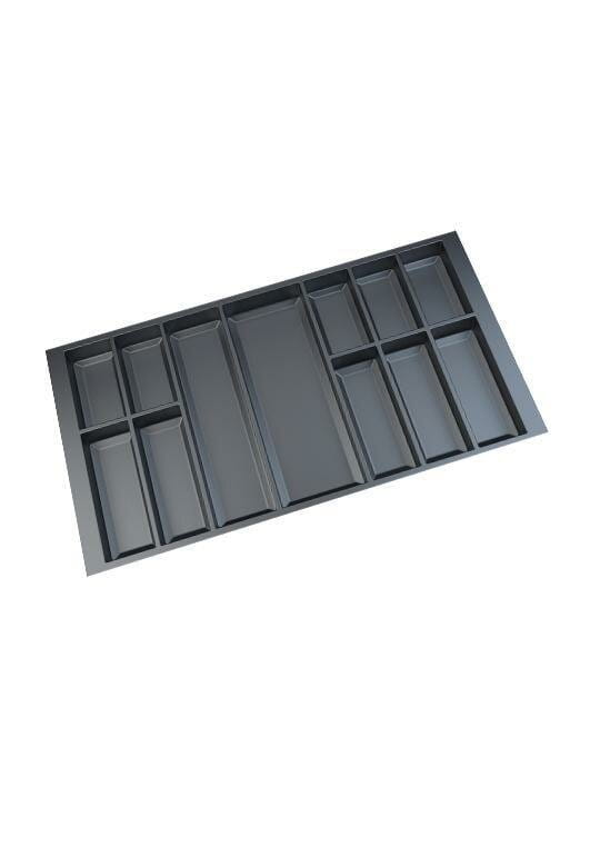 Wkład na sztućce i akcesoria kuchenne Classico jest dopasowany do szuflad Merivobox firmy Blum. Wkład pasuje do szuflad o zewnętrznej szerokości frontu 900 mm i głębokości prowadnicy 500 mm. Kolor wkładu antracyt.