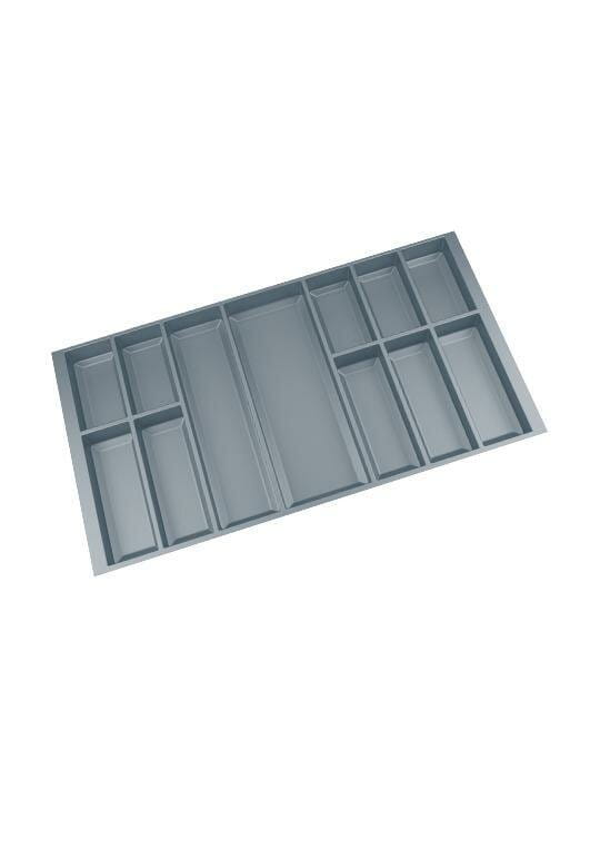 Wkład na sztućce i akcesoria kuchenne Classico jest dopasowany do szuflad Merivobox firmy Blum. Wkład pasuje do szuflad o zewnętrznej szerokości frontu 900 mm i głębokości prowadnicy 500 mm. Kolor wkładu szary.