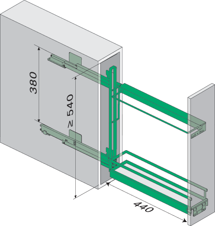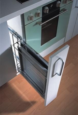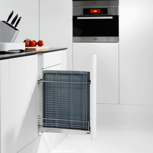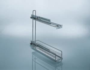 Wyciąg podblatowy do szafki wąskiej o szerokości frontu 150 mm. Wykorzystywany do przechowywania blach lub stolnicy. Prowadnica umieszczona pod koszykiem, dzięki czemu wykorzystujemy całą powierzchnię użytkową bardzo wąskiej szafki. System wykonany jest z chromowanej stali, a fakturowane dno półki spełnia funkcję antypoślizgową.