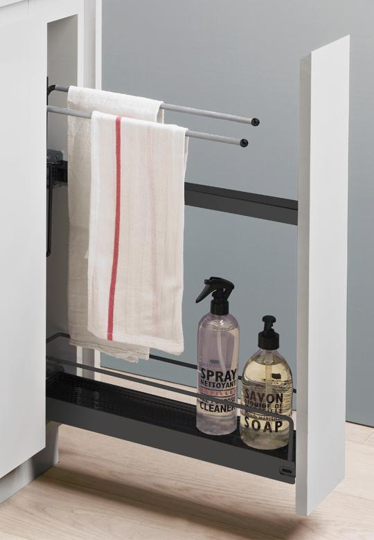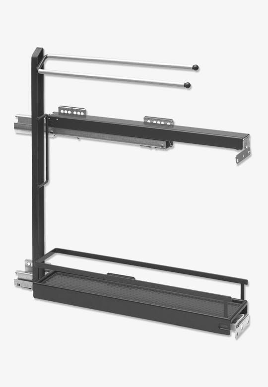 System "15" z wieszakiem i półką jest tak skonstruowany, że stanowi integralną całość ze sobą, dostępny jest jako kompletne cargo z dwoma wieszakami na ścierki i jedną dolną półką. Cały stelaż i dolna półka wykonane są ze stali malowanej proszkowo w kolorze antracytowym. Półka posiada fakturowane dno spełniające funkcję antypoślizgową, a boczne ścianki wykończenie są jednym płaskim relingiem. Natomiast na wieszaczki dodatkowo nałożona jest specjalną gumową powłoką, która zapobiega zsuwaniu się umieszczonych na nich ściereczek kuchennych. Wyciąg "15-tka" posiada dwie prowadnice, przez co zapewniona jest większa stabilizacja. Całe cargo montujemy zawsze do prawej strony korpusu szafki. Główny mechanizm doposażony jest w adaptery wspomagające wpięcia stelaża w prowadnice oraz ułatwiające regulację frontu w trzech płaszczyznach, bez konieczności demontażu systemu. Całkowite obciążenie tego bardzo wąskiego wyciągu jest bardzo duże i wynosi 10 kg, natomiast obciążenie dolnego koszyka to max.6 kg.
