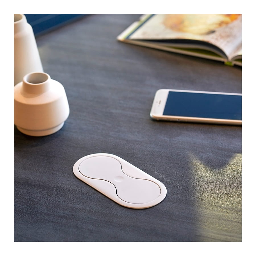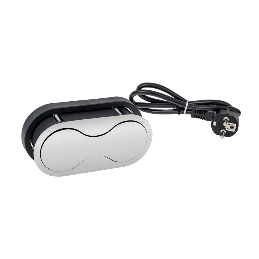 EIGHTBOX to nowoczesne gniazdo meblowe z rotacyjnie otwieraną przesłoną, która uruchamia się po naciśnięciu jej środkowej części (przetestowana na 40 tys. cykli). Metalowa osłona obraca się po okręgu o średnicy fi 130 mm. Pod przesłoną kryją się dwa gniazda francuskie 230V AC/16A, do których można podłączyć urządzenia o maksymalnej mocy 3 680W.