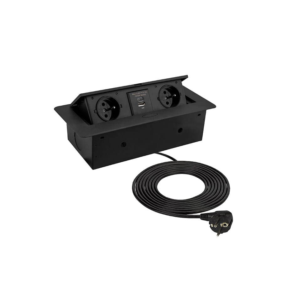 KOMBIBOX kolor czarny, 2x gniazdo francuskie, 1xUSB A, 1xUSB C, przewód zasilający 1,5m
